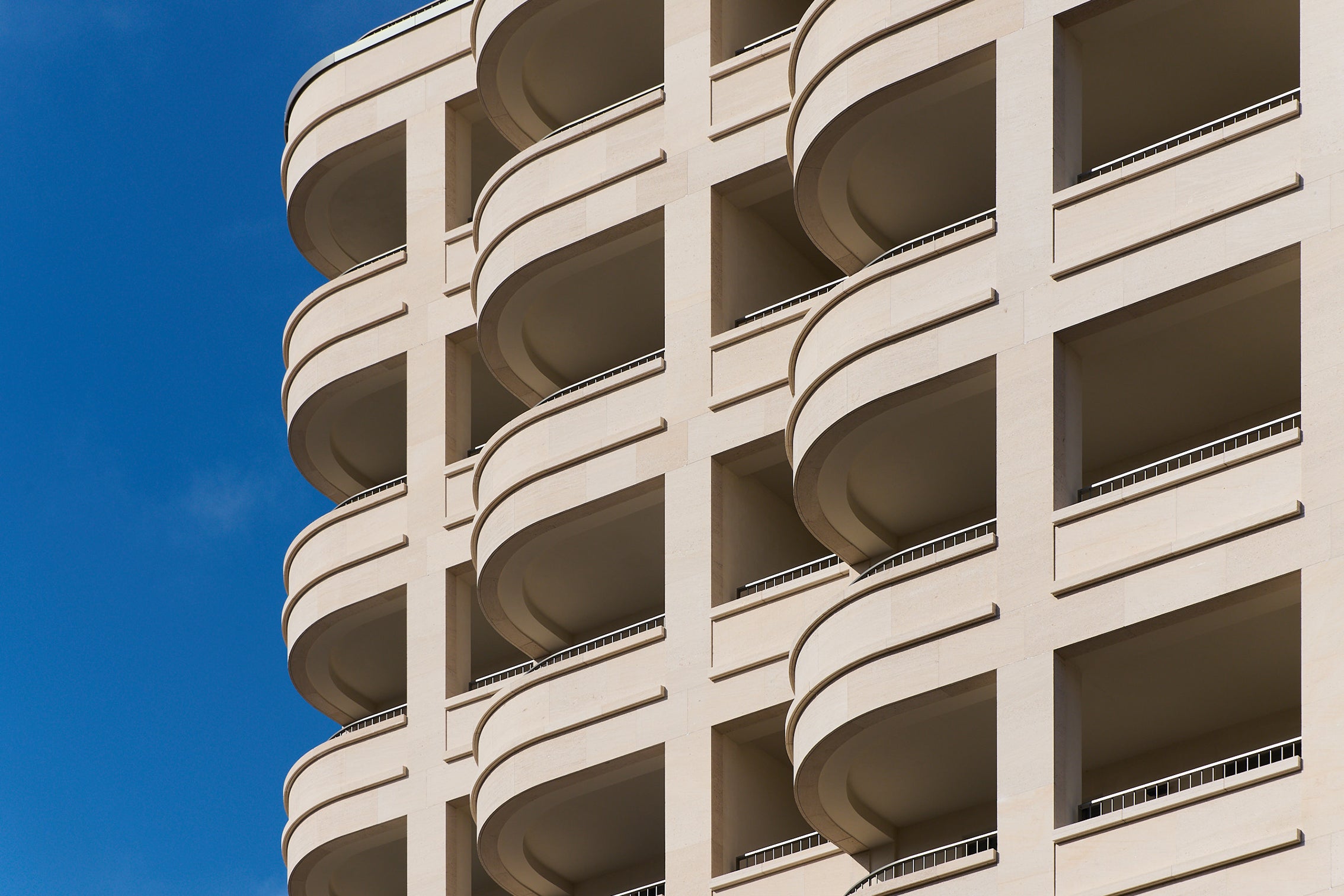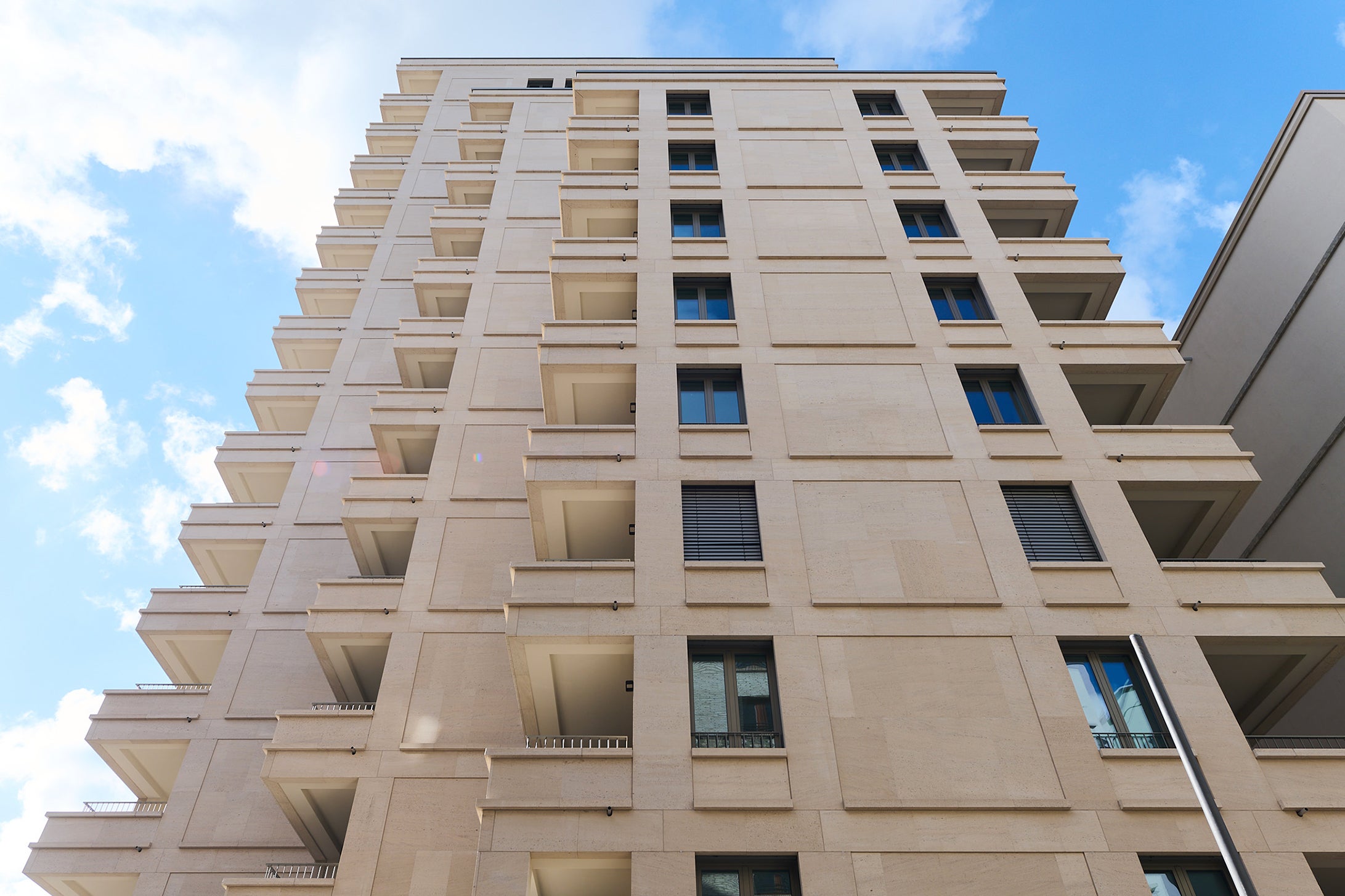 The architecture for DREI HORIZONTE (component E1) was designed by Stefan Forster Architekten, for the largest building by Ortner & Ortner Baukunst (component E2) and for component E3 by Karl Dudler Architekten. The DREI HORIZONTE project won the DNP German Natural Stone Award in 2024 and was the winner in the category ‘Facades with ventilated exterior wall cladding made of natural stone’.