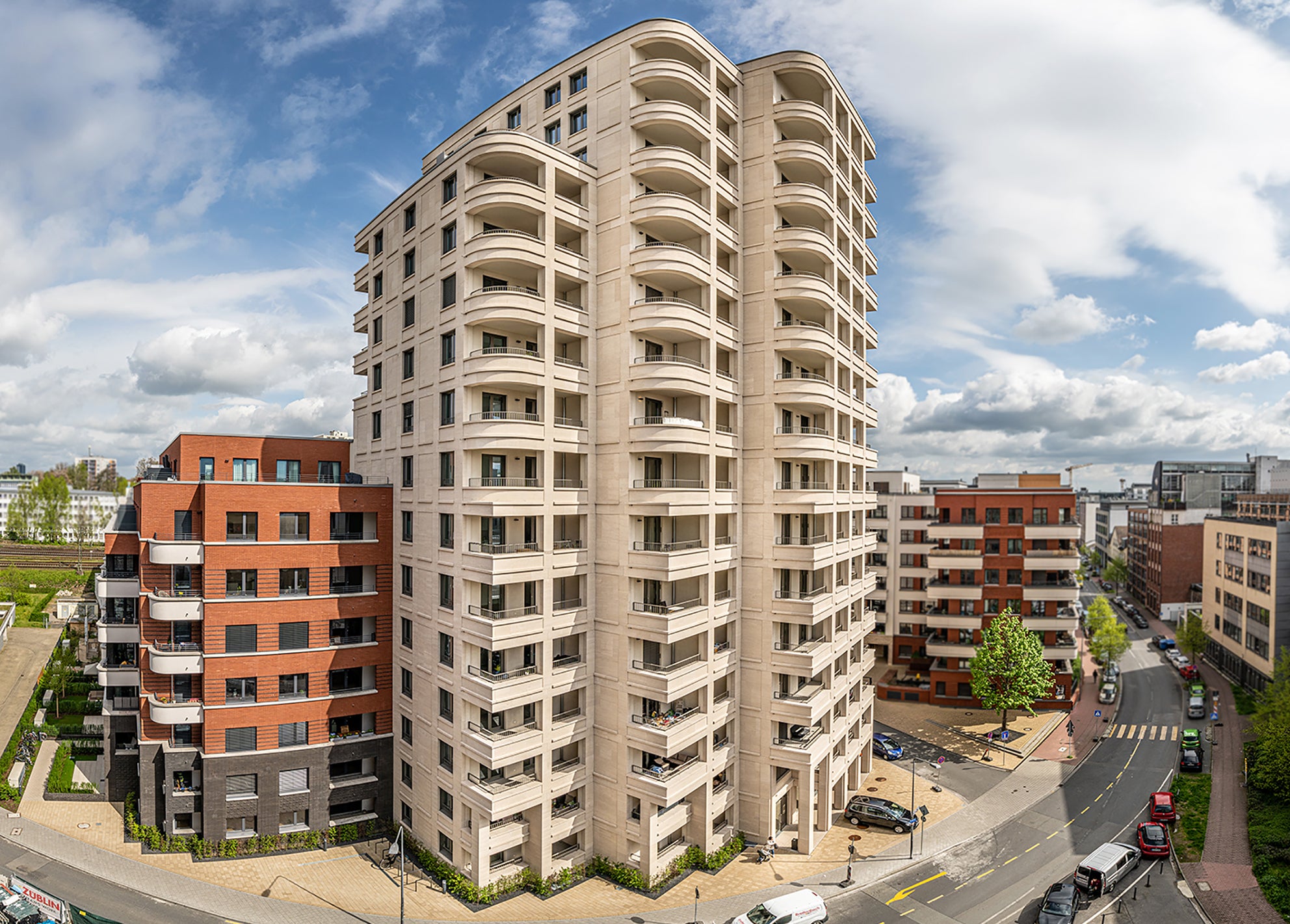 The DREI HORIZONTE ensemble is located in Frankfurt's up-and-coming Ostend district, in the immediate vicinity of the European Central Bank (ECB). The plot size is around 3,000 m². The largest building comprises 123 flats on 16 floors, while the two flanking buildings have seven and eight floors with 34 and 51 flats respectively.