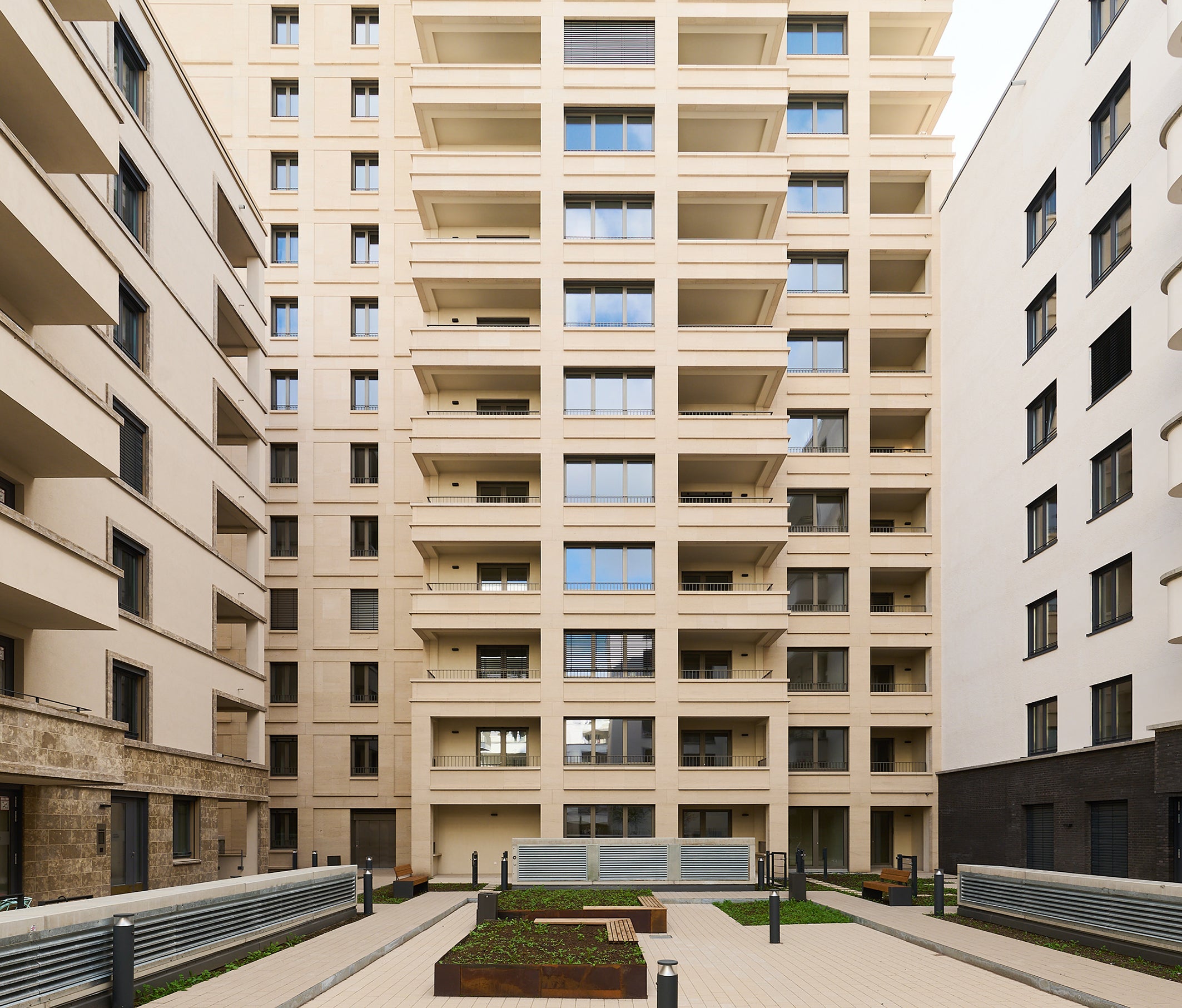 A landscaped, green inner courtyard blends in harmoniously and offers important recreational qualities. The DREI HORIZONTE residential quarter has been awarded the gold certificate by the German Sustainable Building Council (DGNB).